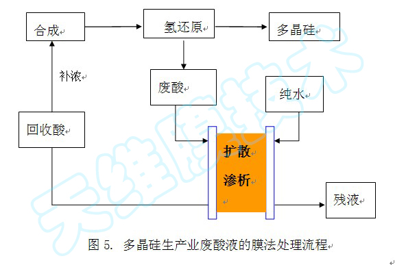 多晶硅是制造單晶硅、太陽能電池及高純硅制品的主要原料。在多晶硅的生產(chǎn)中會(huì)產(chǎn)生大量的廢酸。用擴(kuò)散滲析法回收該廢酸再返回系統(tǒng)使用,這樣既為企業(yè)節(jié)約了資源,又解決了環(huán)境污染問題。