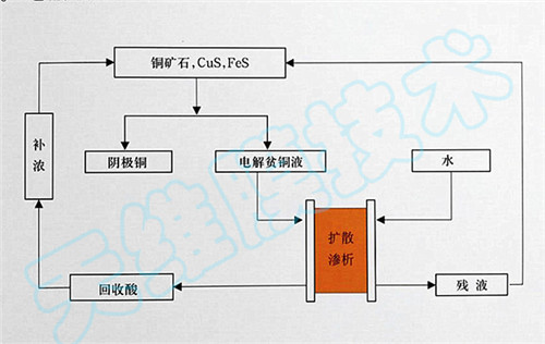 濕法煉銅生產(chǎn)中產(chǎn)生大量的電解貧液,若用石灰中和,除造成酸和銅的損失外,還引發(fā)環(huán)境問題。用陰膜擴散滲析回收電解貧液中的廢酸再返回系統(tǒng)使用,這樣既為企業(yè)節(jié)約了資源,又解決了環(huán)境污染問題。